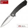 В составе ножа – чрезвычайно прочная, стойкая к износу сталь марки D2. Защищённый от коррозии металлический сплав демонстрирует высокие показатели твёрдости. Значение твёрдости у ножа –порядка 60 единиц по шкале Роквелла, что довольно хорошо для данного вида продукции. Тип заточки – прямой. Длина клинка насчитывает восемь с половиной сантиметров, толщина – три с половиной миллиметра. Нож складной, лезвие извлекается при помощи удобного замка Flipper. Skimen-CF надёжным образом защищён от случайного открытия либо закрытия. Он безопасен в эксплуатации, и имеет простую конструкцию. Общая длина ножа составляет 20,5 сантиметра. Такие скромные габариты дают преимущество ножу для применения каждый день. Его можно запросто поместить в сумку либо карман, и использовать по необходимости, модель всегда под рукой.